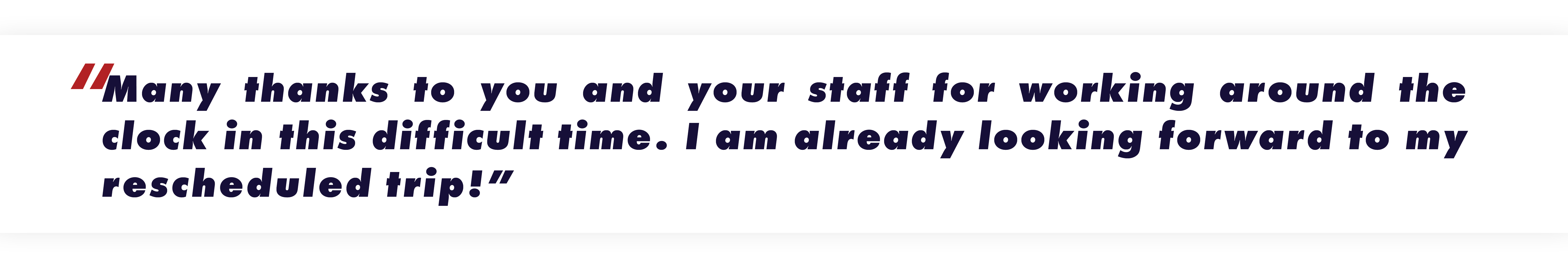 We are working with an experienced call center which allows our teams to do what they do best. Our Tour Coordinators are optimizing rescheduled travel by revising itineraries, appointments, bookings, and more, while our Customer Service Team is remaining focused on maximizing and expediting refunds for cancelled participants.